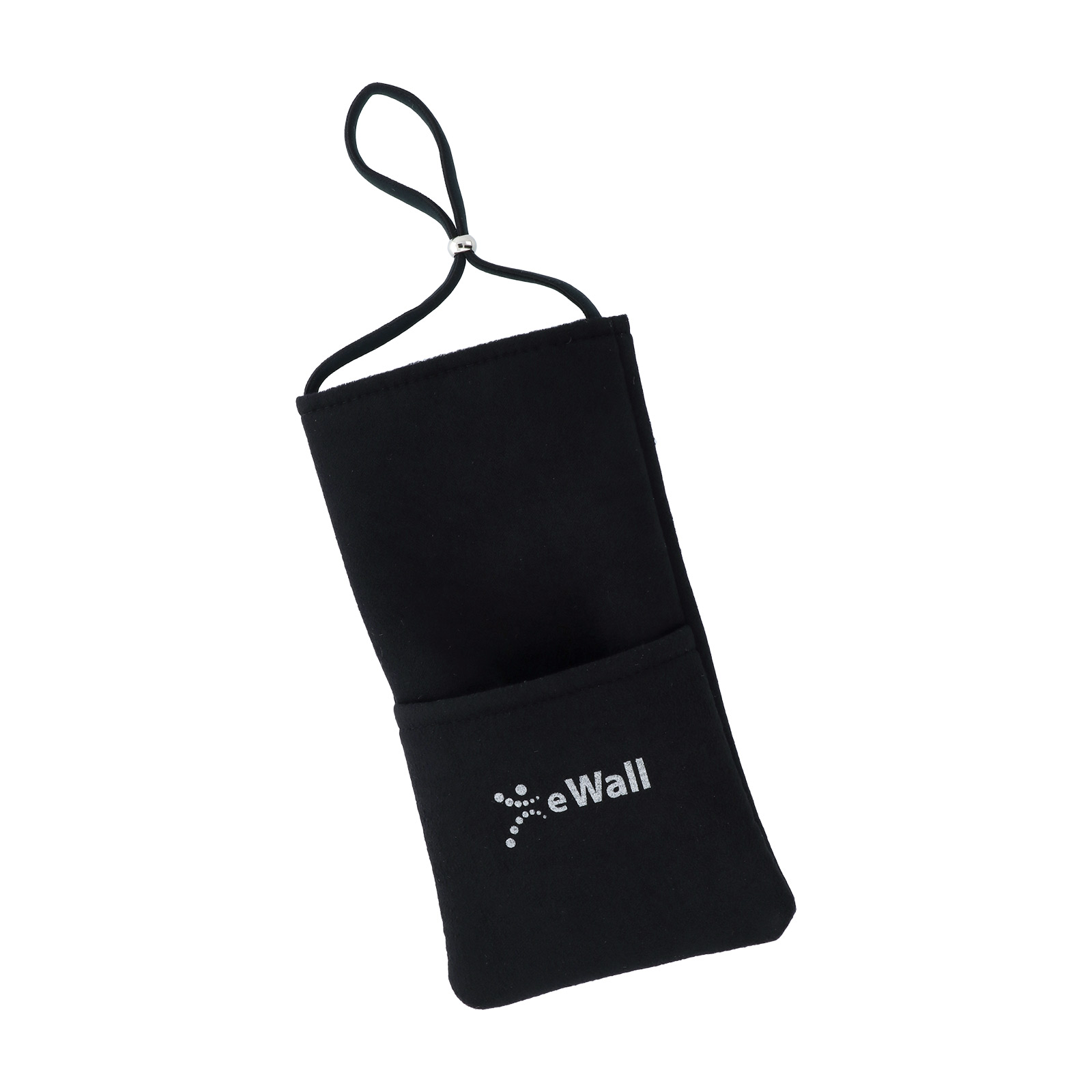 Simply place your mobile phone inside the large eWall bag, whether at work or during your free time. Fold it down and securely seal it with the rubber band – after 30 seconds you will no longer be available. However, due to the extremely high radiation values when in the close vicinity of radio towers (<100 metres), the possibility of reception activities was ascertained in isolated cases, despite a thorough sealing of the mobile phone bag. This is not caused by a defect of the product. In these cases you should remove your mobile phone from the eWall mobile phone bag after 30 seconds, you will determine a clear reduction of the reception on the display of your mobile. Approx. 20 seconds after removing the phone, full reception will return. The inconvenient entering of the PIN code is no longer necessary. Please treat the eWall mobile phone bag with care. You can brush the eWall bag (damp) or wash it by hand at a maximum of 30° C.